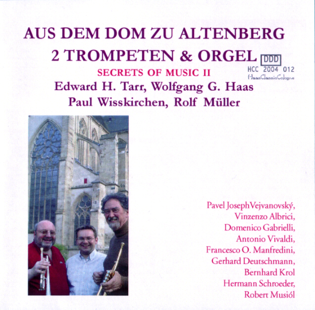 Untertitel: 2 Trompeten und Orgel - Secrets of Music II Komponisten: P.J. Vejvanovský, V. Albrici, D. Gabrielli, A. Vivaldi, F. Manfredini, G. Deutschmann, B. Krol, H. Schroeder, R. Musiól Label: Wolfgang G. Haas Musikverlag HCC 2004012 Gesamtspielzeit: 66:05 Aufnahmetechnik: DDD Produktion: 2004 Label-Website: www.haas-koeln.de (>>> hier zu bestellen) Interpreten: Edward H. Tarr u. Wolfgang G. Haas (Trompeten), Rolf Müller (Orgel) Instrument: Klais-Orgel im Altenberger Dom (1980)