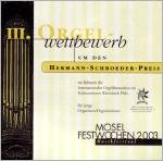 Der dritte Internationale Orgelwettbewerb um den Hermann-Schroeder-Preis fand vom 25. bis zum 28. September 2003 in Trier statt. Es war wiederum ein Kooperationsprojekt zwischen der Hermann-Schroeder-Gesellschaft, den Internationalen Orgelwochen im Kultursommer Rheinland-Pflaz und den Mosel Festwochen. Der erste und zweite Durchgang des Wettbewerbs fand an der Tzschökel-Orgel in St. Antonius statt, das Finale an der großen Klais-Orgel im Trierer Dom. Die Teilnehmerzahl war diesmal gering; nachdem sich nur wenige gemeldet und noch einige im letzten Moment abgesagt hatten, waren es schließlich sechs Teilnehmer, die aus drei Ländern kamen: Deutschland (3), Belgien (2) und Südkorea (1). Auch die Jury war internazional besetzt mit Domorganist Prof. Clemens Ganz (Köln, Juryvorsitz), Prof. Johannes Geffert (Köln), Prof. Anne Froidebise (Lüttich), Kathedralorganist Carlo Hommel (Luxemburg) und Domorganist Josef Still (Trier). In das Finalkonzert kamen drei Bewerber. Jeder spielte zwei große Kompositionen, eine von der der Jury vorgegebene und eine in freier Wahl. Nach eingehender Beratung kam die Jury zu dem Entschluss, keinen ersten Preis zu vergeben, da keiner der Kandidaten den ersten Preisträgern der beiden vorangegangenen Wettbewerbe entsprach. Somit wurde ein zweiter, ein dritter und ein Förderpreis vergeben.